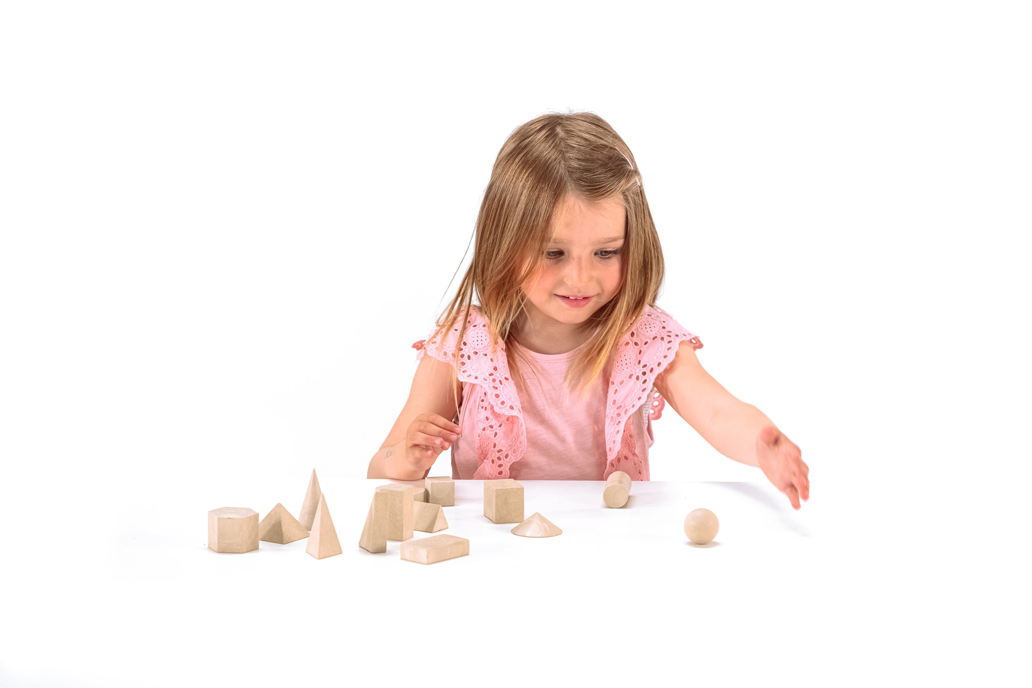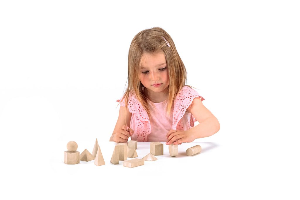 14 verschiedene Körper aus RE-Wood®: 1 Quadratsäule, 1 Würfel (3 x 3 x 3 cm), 1 Quadratpyramide, 2 Rechtecksäulen, 2 dreieckige Säulen, 1 Dreieckpyramide, 2 Zylinder, 2 Kegel, 1 Sechsecksäule, 1 Kugel.Geförderte Kompetenz: