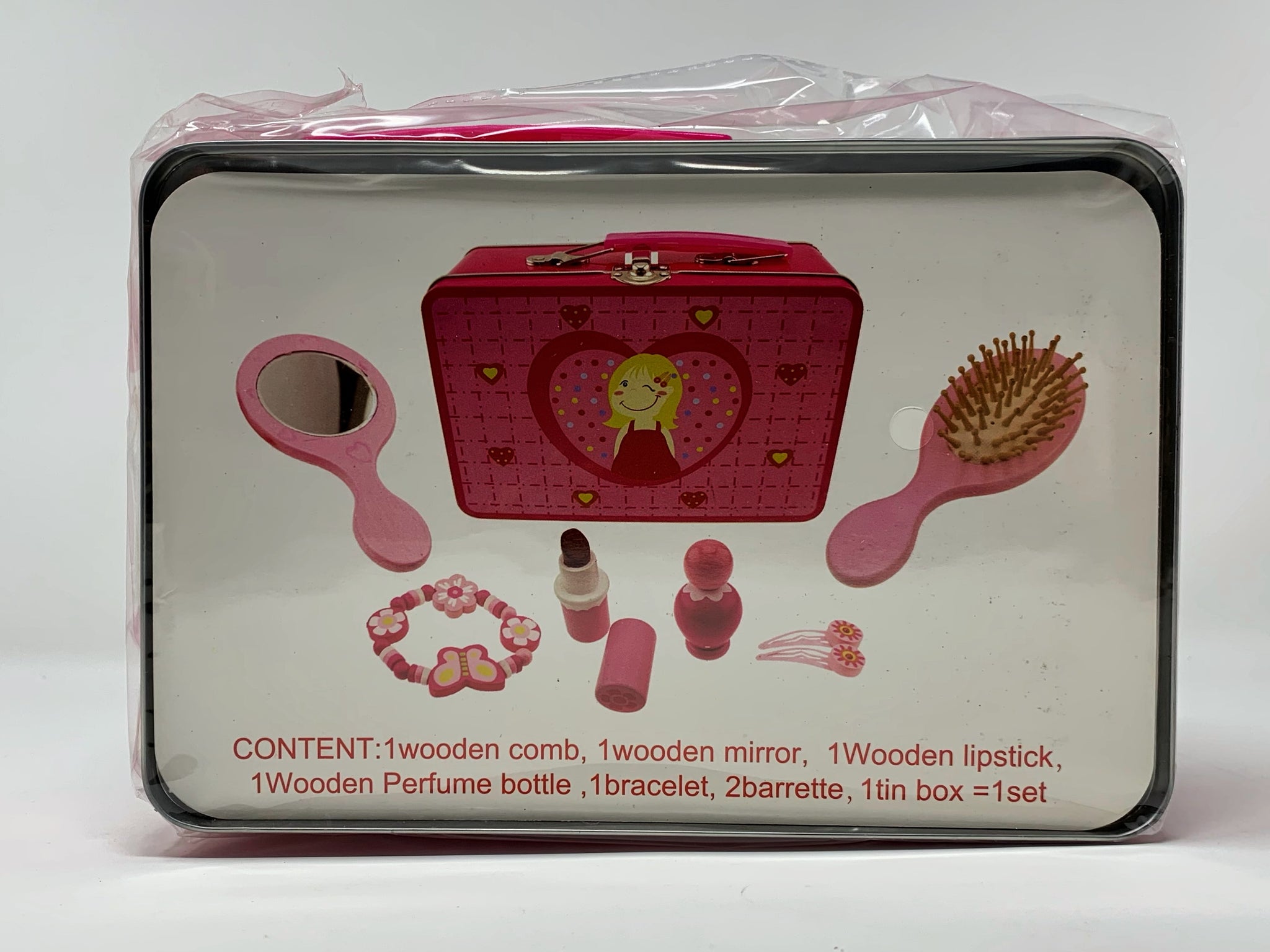 Mit diesem Set wird sich Ihre kleine Prinzessin stundenlang beschäftigen. 8-teiliges Set: Lippenstift und Flacon aus Holz. Spiegel, Haarbürste, Armband, 2 Haarspangen, Metallköfferche.