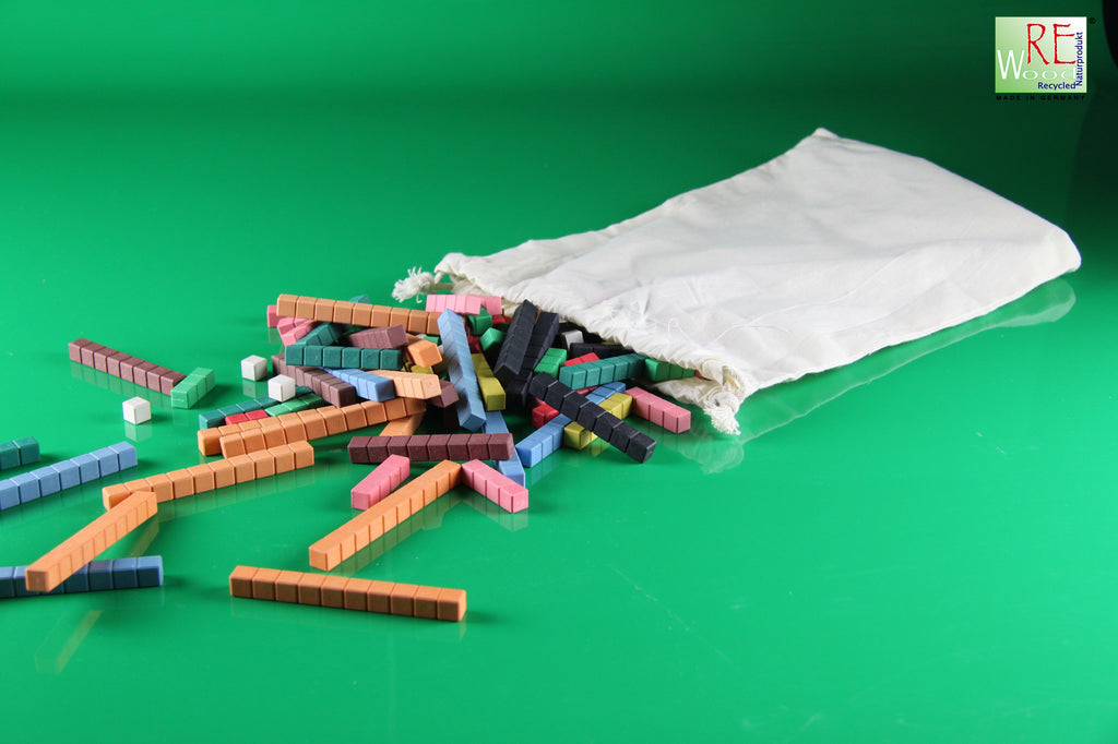 Diese aus RE-Wood® hergestellten Würfel und Stäbe sind in farbiger Ausfertigung erhältlich.Re-Wood® besteht aus Holzmehl von Bäumen aus nachhaltiger Waldbewirtschaftung und einemnatürlichen Bindemittel und ist zu 100% biologisch abbaubar und wiederverwertbar.Das Material ist schadstofffrei und ungiftigSie sind besonders gut geeignet zum Üben von Addition und Subtraktion, zur visuellen Darstellung des Zahlenraums.Der Satz besteht aus 126 Rechenstäben:36 weiße Würfel Kantenlänge 1 cm, 18 rote 2 cm-, 18 hellgrüne 3 cm-, 12 rosa 4 cm-, 8 gelbe 5 cm-,6 dunkelgrüne 6 cm-, 6 schwarze 7 cm-, 6 braune 8 cm-, 6 blaue 9 cm- und 10 orange 10 cm Stäbe.Verpackt ist das ganze in einem Baumwollbeutel.