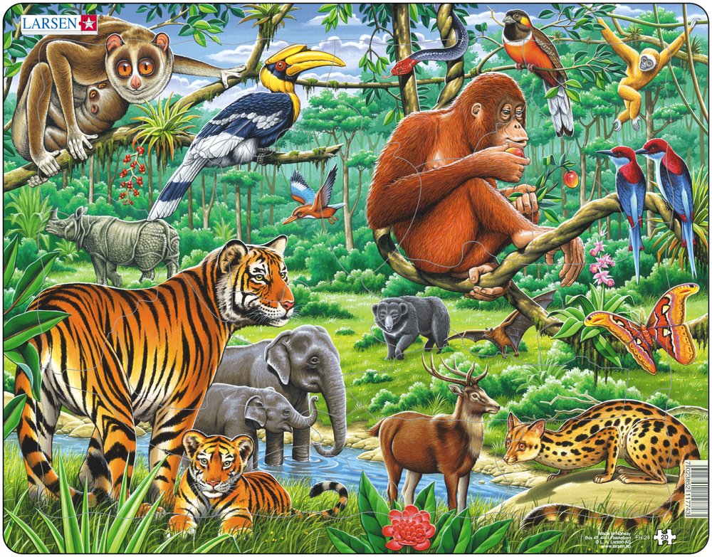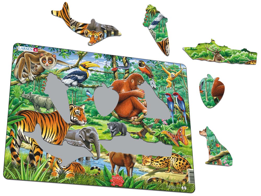 Dieses dekorative Puzzle besteht aus 20 Teilen, von denen einige wie ein Delphin, eine Eistüte, ein Grizzlybär, ein Kreuzfahrtschiff und eine süße Erdbeere geformt sind. Es sind 16 verschiedene Tierarten abgebildet.