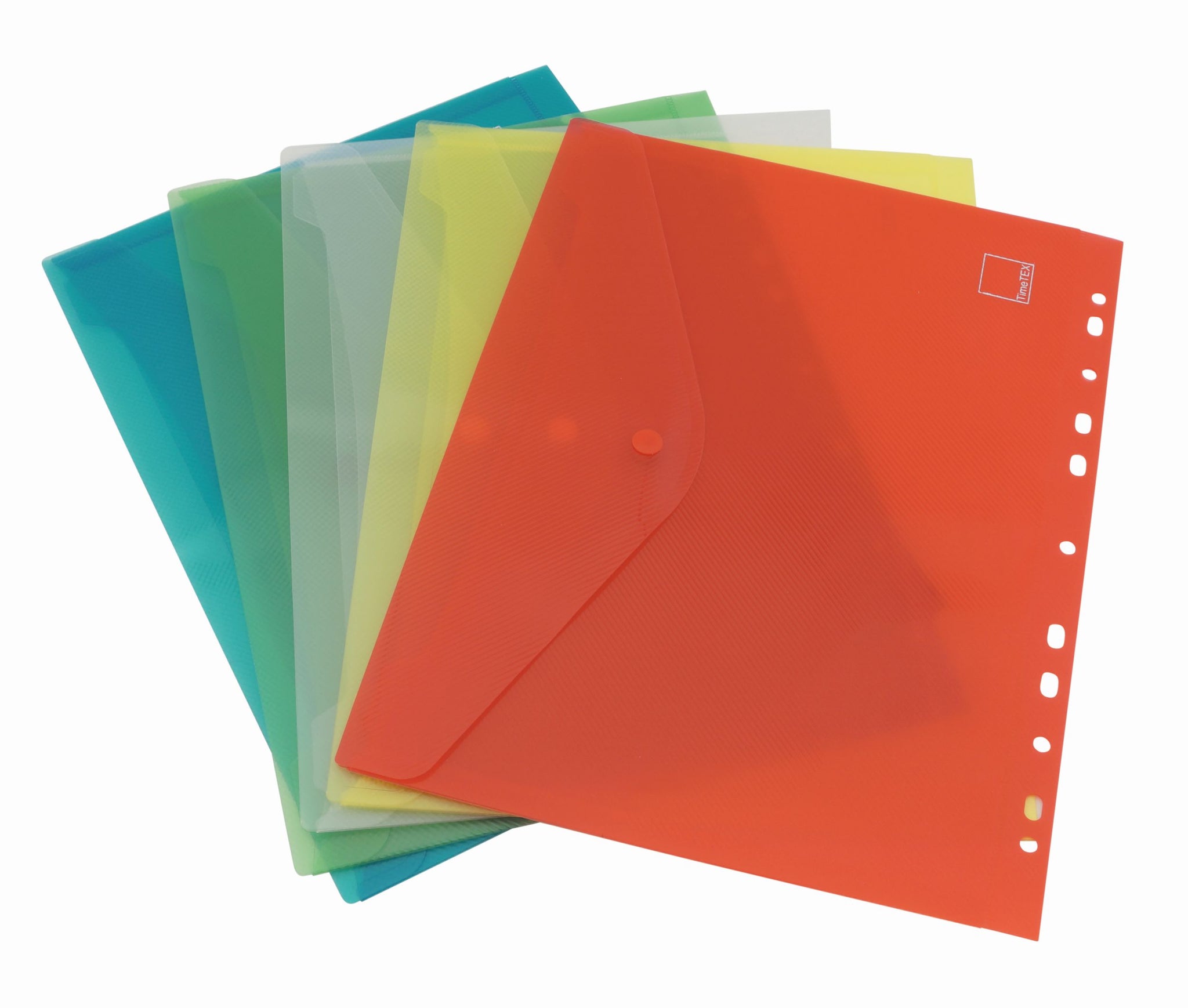 Eine abheft- und verschließbare Dokumentenmappe zur Aufbewahrung von Dokumenten und Unterlagen des Schulalltags. Ein zusätzliches offenes Einsteckfach ermöglicht ein schnelles Ablegen und Entnehmen von Zetteln. Die Farbsortierung ist zur Ordnungskennzeichnung nutzbar. Die Mappen sind aus stabiler, transparenter PP-Folie mit Struktur gefertigt, wodurch der Inhalt sofort zu sehen ist. Die Abheftleiste ist passend für alle Standard-Ordner im Format A4. Die Mappe wird mit einem Druckknopf verschlossen. Je eine Mappe in den Farben rot, blau, grün, gelb und farblos.