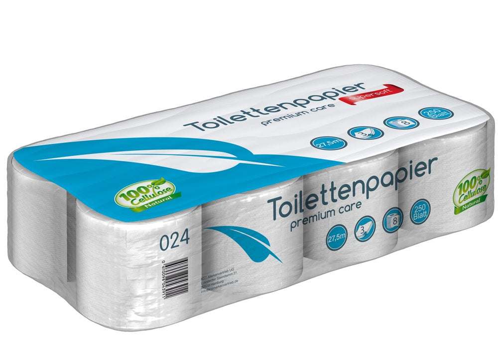 Toilettenpapier premium Care Supersoft 3-lagig, 8 Rollen mit 250 Blatt