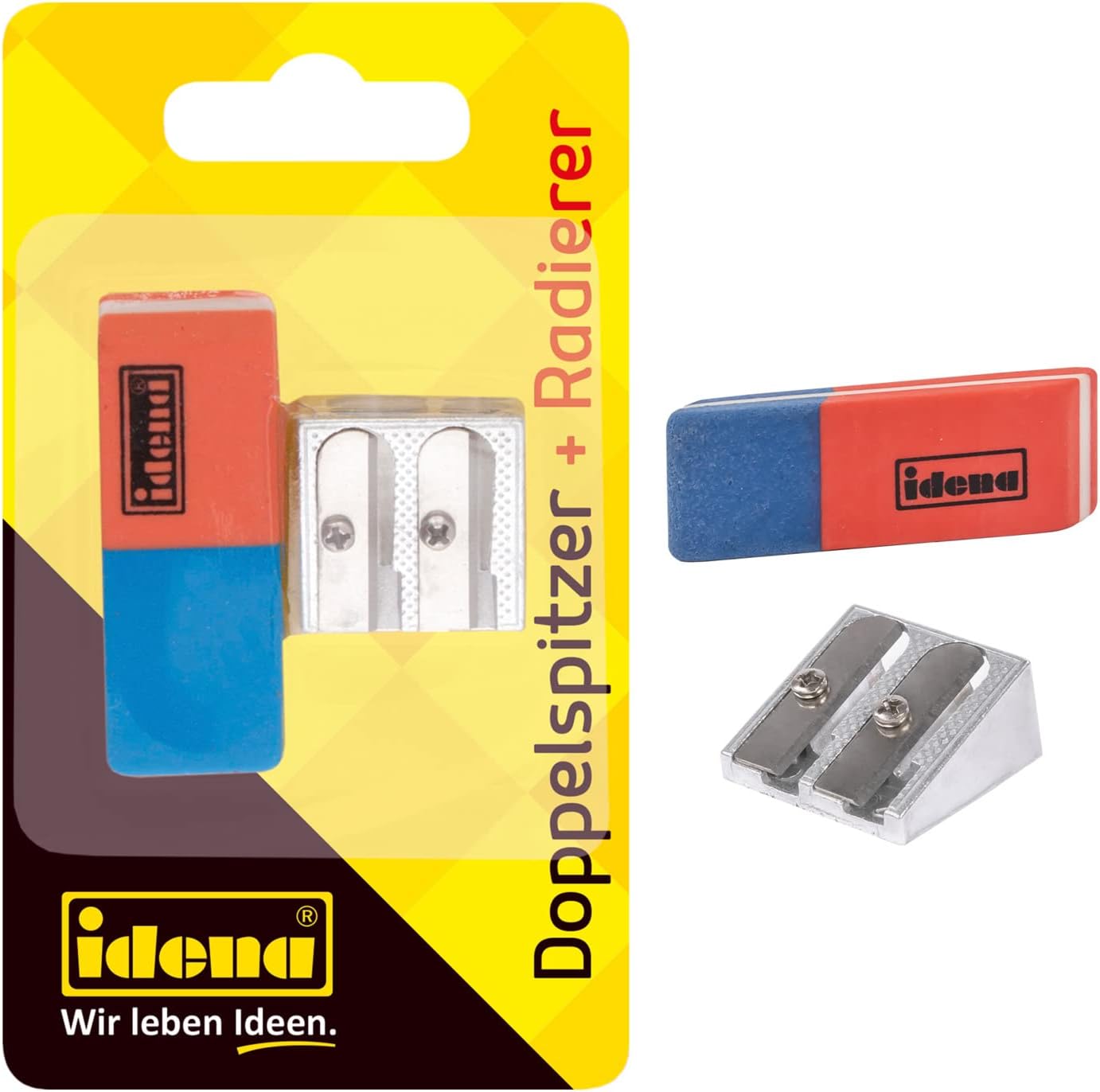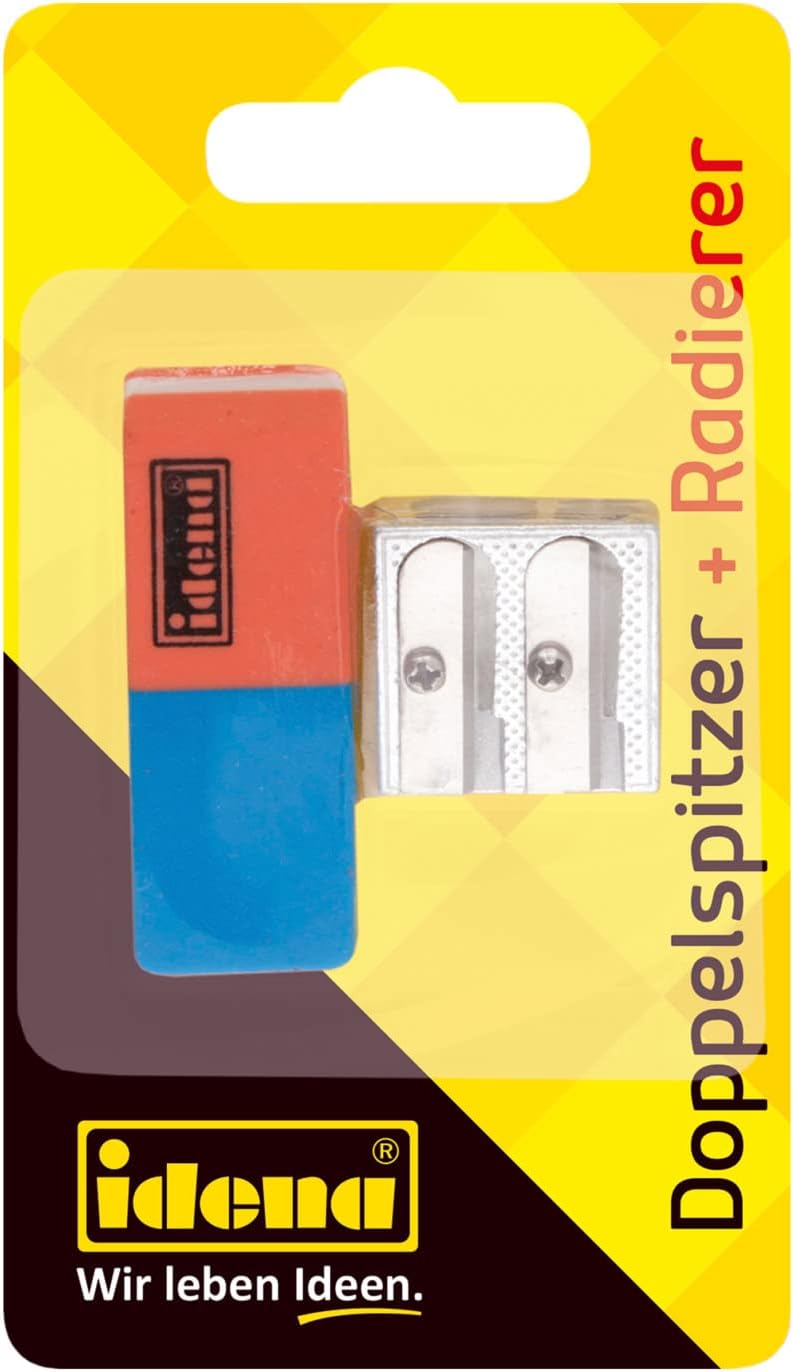Das Radierer und Anspitzer Set von Idena ist ideal für den Schulstart geeignet. Das 2-teilige Set besteht aus einem Doppelanspitzer aus Metall und einem Radiergummi. Der Anspitzer ist für Standard- und Dickkernstifte geeignet. Der Radiergummi ist für Bleistift, Farbstift und auch für die Entfernung von Tinte geeignet. Dieses Set darf in keinem Federmäppchen fehlen.