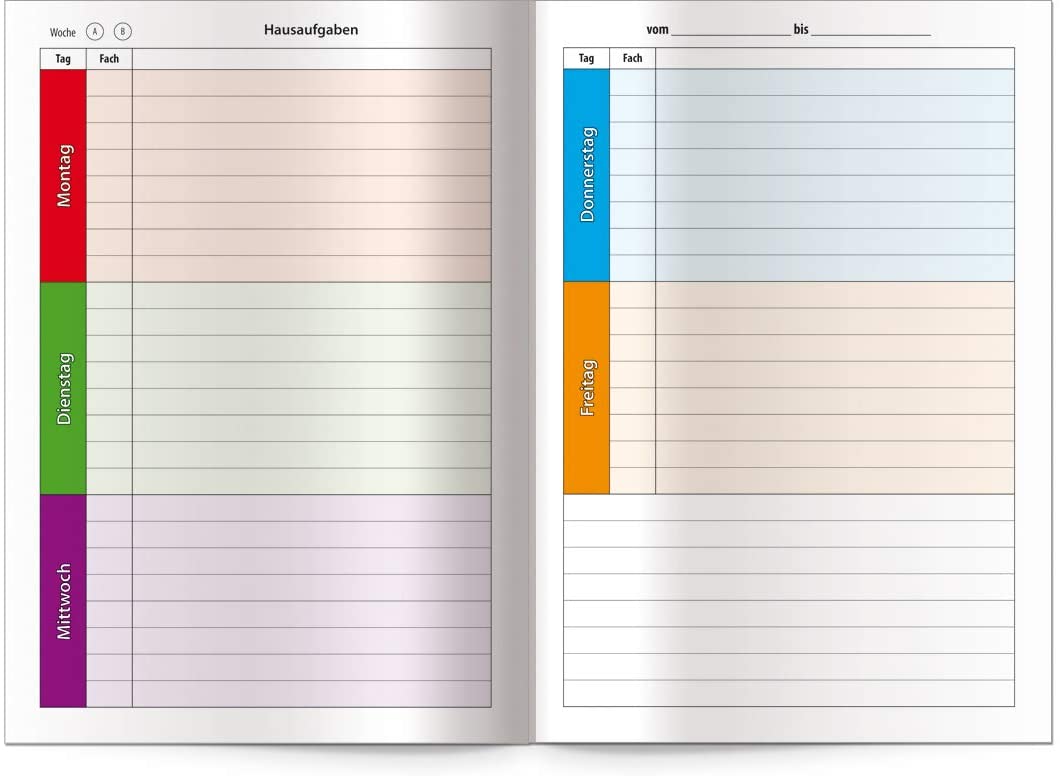 - eine Woche auf zwei Seiten, jeder Tag hat eine eigene Farbe, mit A+B Woche