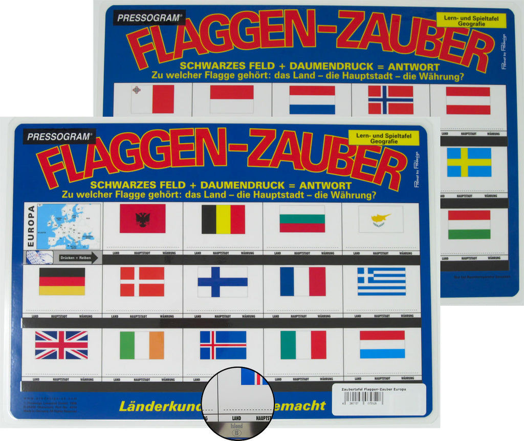 PRESSOGRAM Zaubertafeln sind immer wieder verwendbare, interaktive Lern- und Spieltafeln. Durch die verblüffende Funktion der Selbstüberprüfung werden Kinder spielerisch zum Lernen und Üben motiviert. Kinder schreiben die Lösungen mit einem trocken abwischbaren Folienstift auf die Tafel. Danach wird mit dem Finger über das temperatursensitive schwarze Feld gerieben. Die Zaubertinte wird durch die Übertragung von Wärme durchsichtig und macht die darunter verborgenen Lösungen kurzfristig sichtbar. Danach kühlt das Selbstüberprüfungsfeld wieder ab und alles ist wieder unsichtbar. Diese Umkehrreaktion ist immer wieder aktivierbar.