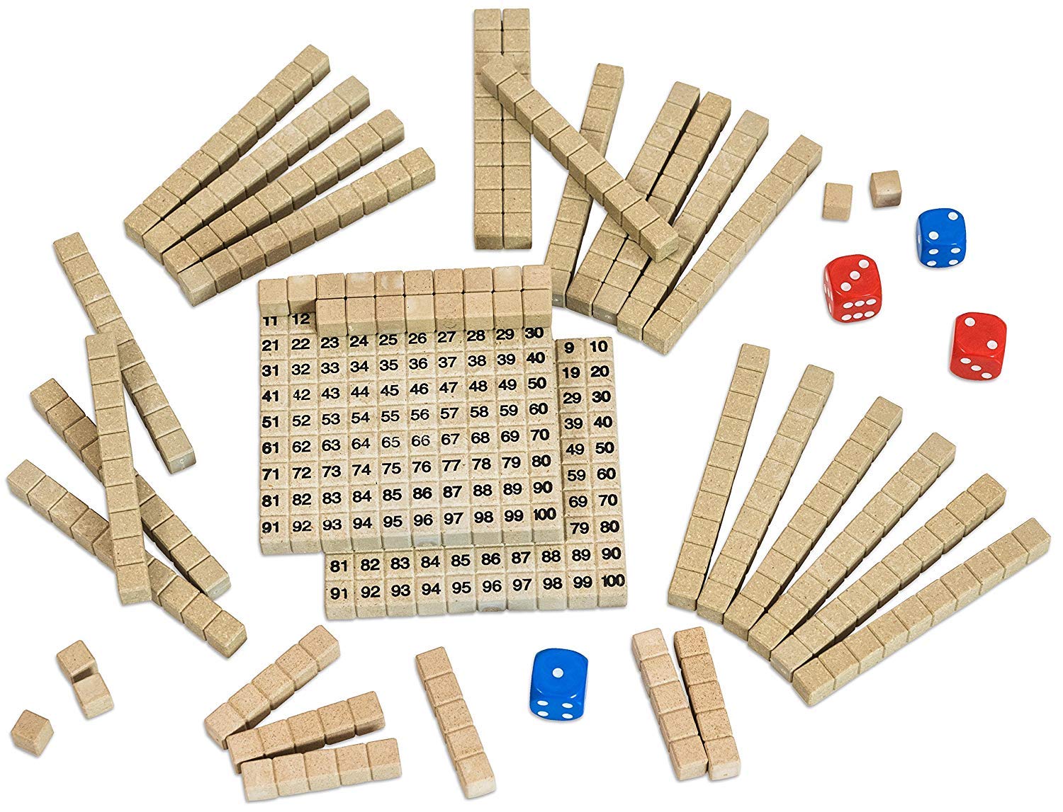 - 2 Hunderterplatten mit und ohne aufgedruckte Zahlen, 22 Zehnerstäbe, 6 Fünferstäbe und 28 Einerwürfelchen aus RE-Wood®, je 2 rote und blaue Würfel, 1 Anleitung
