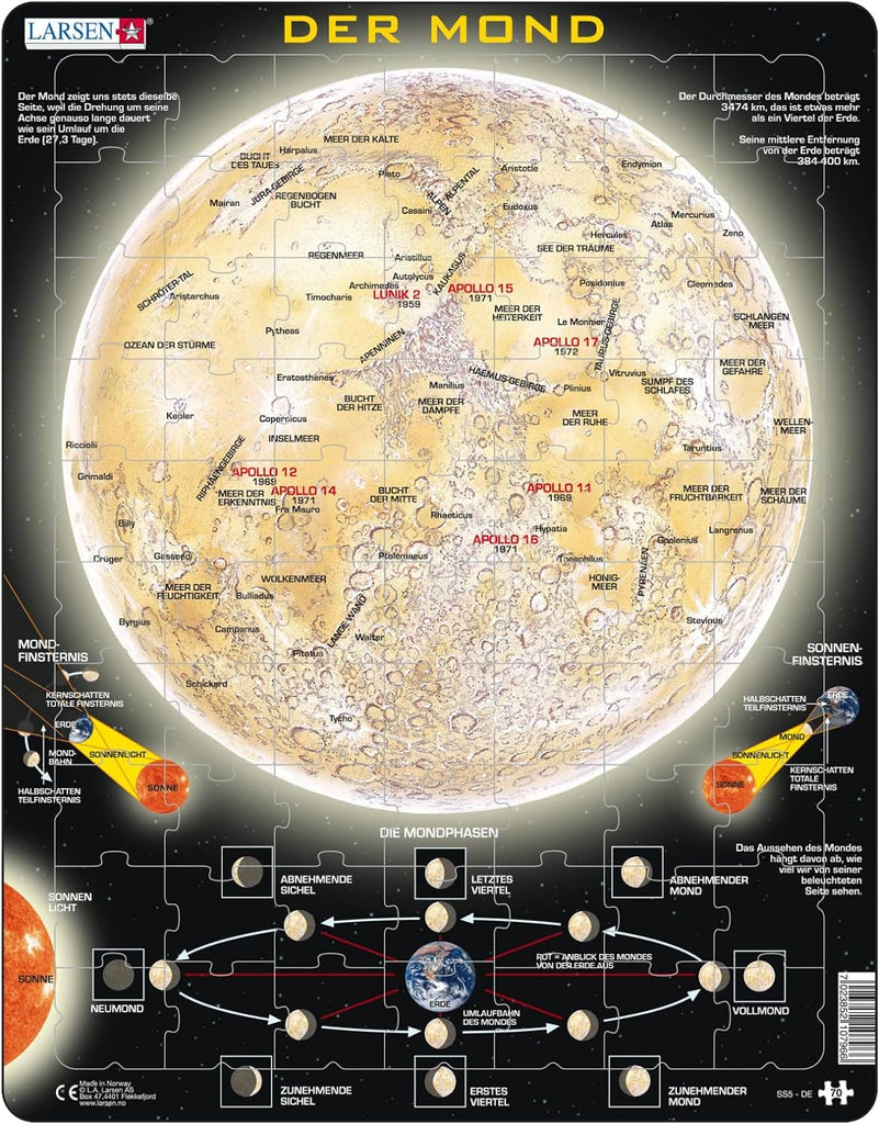 Puzzle mit Bild des Mondes und Namen der Berge, Täler und Gebiete. Es wurden auch einige Orte markiert, an denen Raumschiffe gelandet sind. Auf der Unterseite finden Sie die Mondphasen unter vielen nützlichen Informationen.