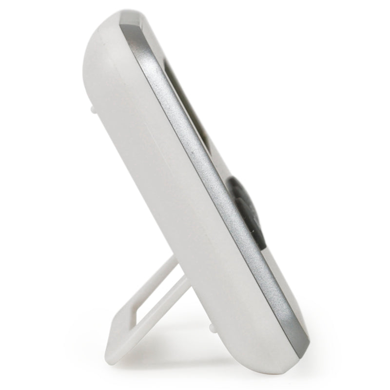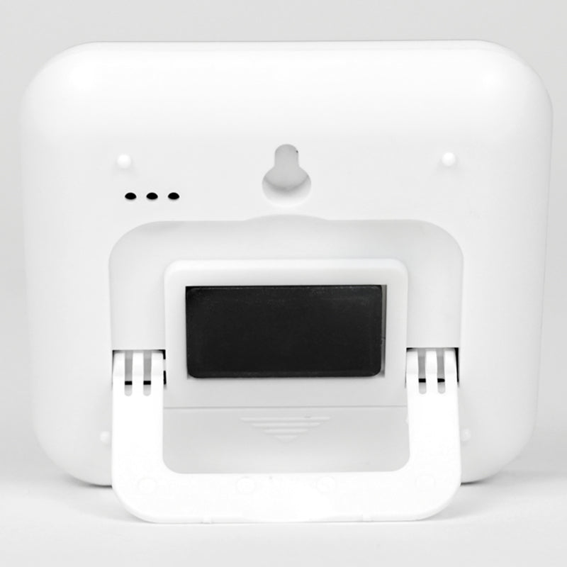 Durch den Batteriebetrieb läuft die Uhr absolut lautlos. Lediglich beim Bedienen der 3 Tasten gibt die Uhr Laute von sich. Mit einem Klappstativ auf der Rückseite kann sie entweder auf den Tisch gestellt oder mit der Aufhängebohrung an die Wand gehängt werden. Zusätzlich verfügt sie auf der Rückseite über einen Magneten, mit dem sie an magnethaftenden Flächen, wie z.B. Stahl-Emaille-Tafeln, befestigt werden kann.