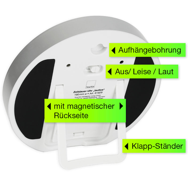 Auf der Rückseite befinden sich ein Klapp-Stativ zum Aufstellen der Uhr auf einem Tisch, Magnete zur Befestigung z.B. an der Tafel und eine Wand-Aufhängebohrung.